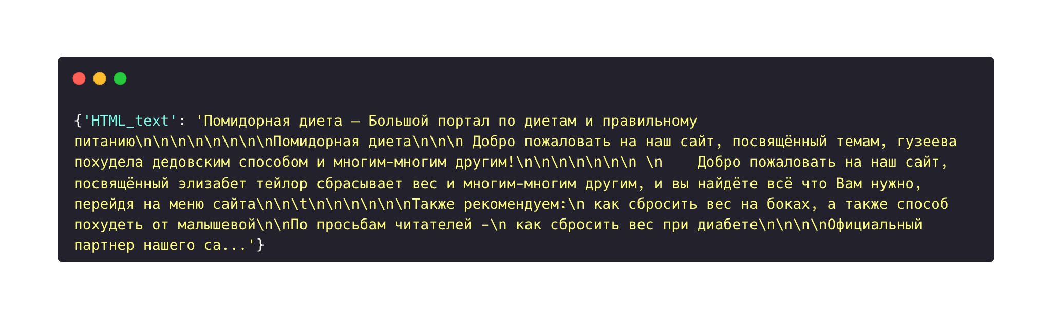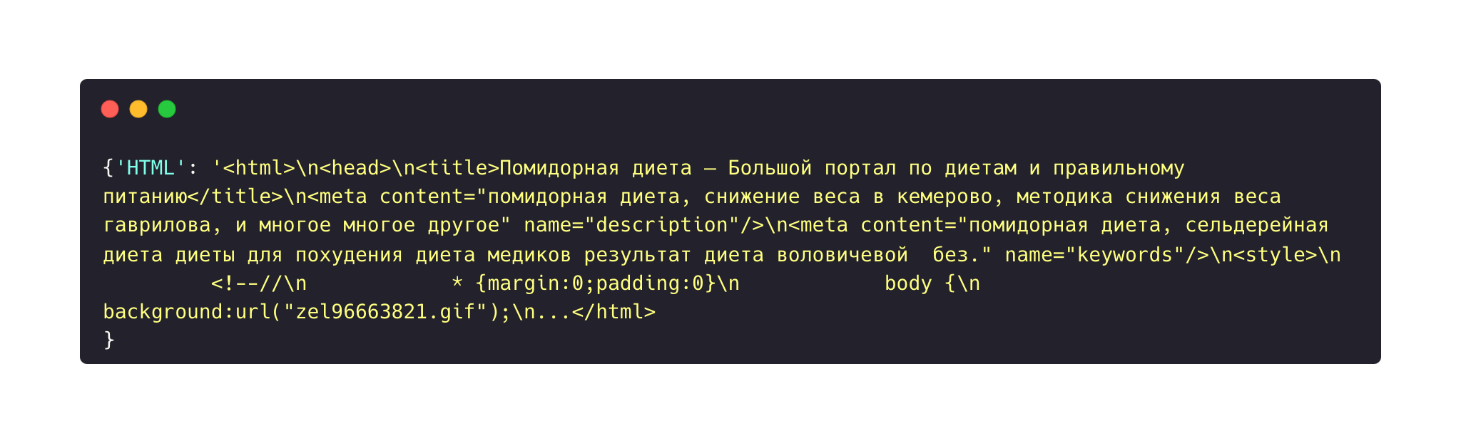 | main_page_html | словарь html-документов главной страницы сайта | string | Строка, содержащая словарь html-документов глвной страницы и фреймов главной страницы Словрь содержит ключи: - HTML - ключ содержит html-документ главной страницы сайта - {frame/iframe}HTML_{значение атрибута 'src' фрейма} - ключ содержит html-документ тэга frame/iframe главной страницы сайта Ключи могут принимать следующие значения: - строка с html-документом - код статуса http ответа в случае огибки получения доступа к сайту Для конвертации строки в словарь использовать ast.literal_eval(main_page_html) |