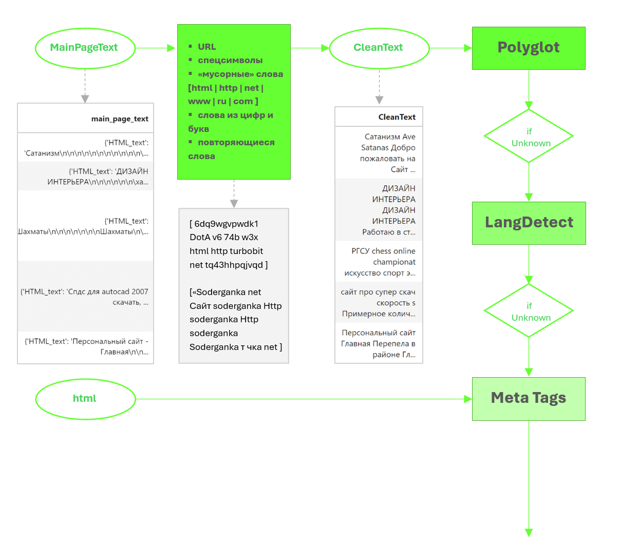 | main_page_text | словарь текстов, содержащихся на главной странице сайта | string | Строка, содержащая словарь текстов главной страницы сайта и фреймов главной страницы сайта Словрь содержит ключи: - HTML - ключ содержит текст главной страницы сайта - {frame/iframe}HTML_{значение атрибута 'src' фрейма} - ключ содержит текст в тэге frame/iframe главной страницы сайта Ключи могут принимать следующие значения: - строка с текстом - код статуса http ответа в случае огибки получения доступа к сай Для конвертации строки в словарь использовать ast.literal_eval(main_page_text) |