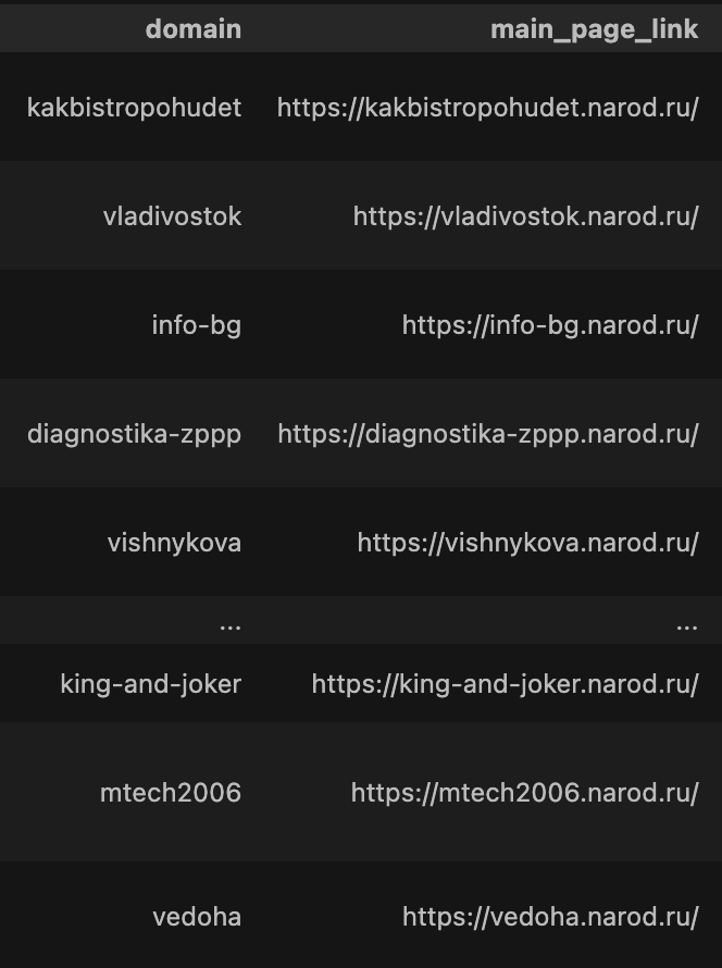 | domain | домен сайта | string | Домены сайтов с хостинга narod.ru |