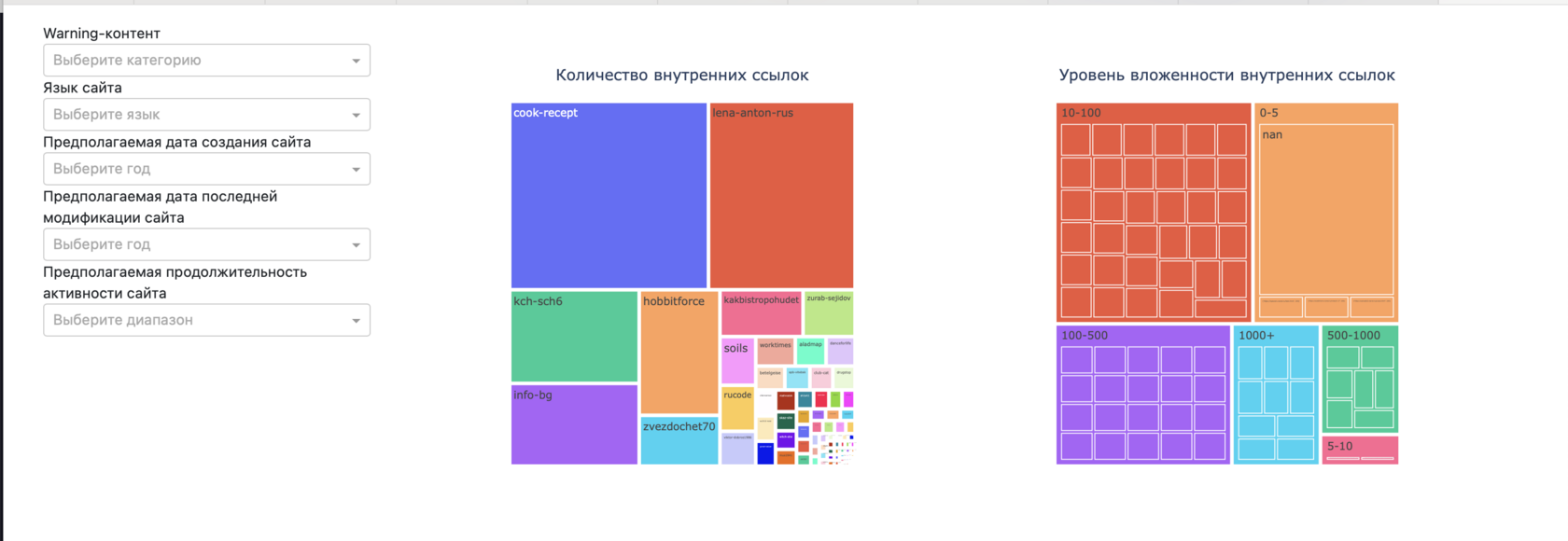 | internal_links | словарь url адресов внутренних ссылок сайта | string | Содержит строку со списоком внутренних ссылок сайта Словрь содержит ключи: - путь к странице относительного адреса главной страницы Ключи могут принимать следующие значения: - код статуса http-ответа при попытке получения доступа к сайту Для конвертации строки в словарь использовать ast.literal_eval(internal_links) |